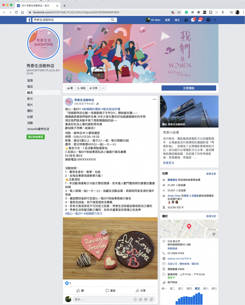 甜心一點DIY #給媽媽的禮物 「母親節特別企劃~母親節親子手作DIY」開始報名囉~~~ 媽媽總是替我們做許多事,今年大家也要好好地感謝媽媽年的辛勞 現在我們就來動手寫下想對媽媽說的話~~ 兼具好吃及心意的餅乾等你唷 歡迎親子同樂一起報名!! 地點:樹林店4F小書房講堂 時間:第一場5/9(六)13:30~14:30 第二場5/9(六)15:30~16:30 對象:適合5歲以上,親子2人一組,每日限額20組 費用:節日特惠價450元/一組(一大一小) 報名方式:1.至活動頁點選參加 2.報名人數超過開課門檻(10組)時,小編將另行公告即可至甜心一點DIY粉絲專頁私訊小編進行報名繳費 EX:姓名:張XX 連絡電話:09XXXXXXXX 報名場次:第一場 活動說明: 1、費用含食材、教學、包裝 2、全程由專業老師教學示範! ⚠️注意須知 1、本活動須達每日10組才開班授課,若未達人數門檻則將於臉書回覆通知唷 2、每人限報一組(一大一小)。為顧及活動品質,其餘陪同家長須於場外等候 3、確認開班後即可至甜心一點DIY粉絲專頁進行報名 4、匯款完成後,恕不接受退款及轉售 5、若有天氣或其他不可抗拒之因素,秀泰生活保留延期或取消之權利 6、秀泰生活保留活動之權利,如有未盡事宜依現場公告為準 #甜心一點DIY #母親節巧克力