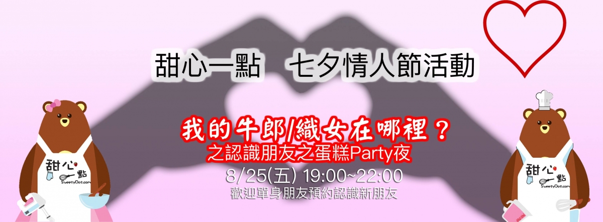 2017-08-22 甜心一點七夕情人節聯誼活動 活動專區, 熊爸日記 by 甜心一點DIY烘焙坊 0 Comments 我的牛郎/織女在哪裡? 認識朋友之蛋糕Party夜 8/25(五) 19:00~22:00 歡迎單身朋友預約來認識新朋友 參加方法:請用電話預約(02)2275-1181 入場費用:只要來做蛋糕就可以了 活動方法:就是聯誼~~ READ MORE
