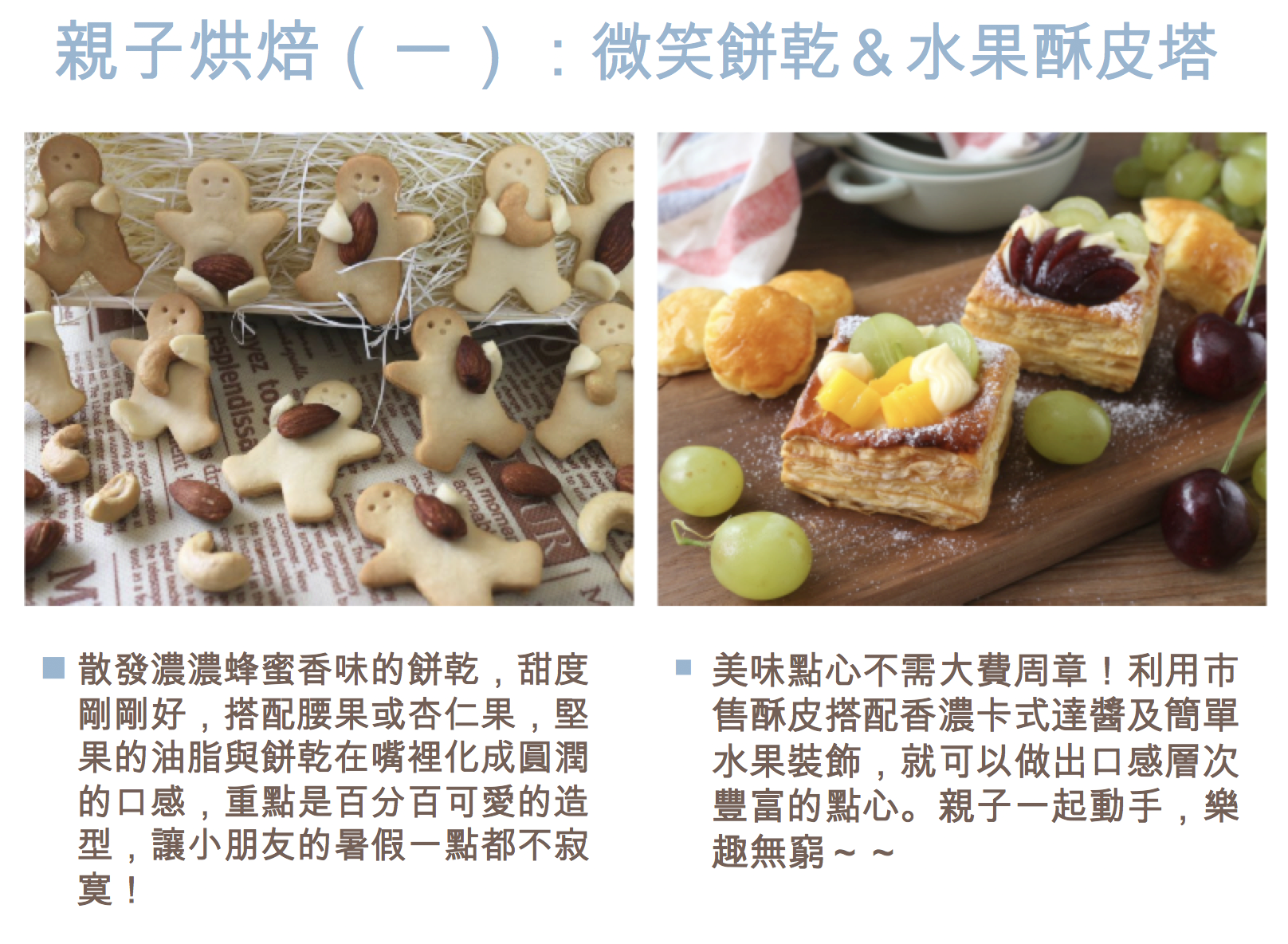 2017-08-22 甜心一點DIY烘焙坊 小小甜點廚師~第二梯開課囉!! 8/30(三)10:00-15:00 活動專區, 熊爸日記 by 甜心一點DIY烘焙坊 0 Comments [小小甜點廚師~第二梯開課囉!!] 內容: 10:00~10:30 報到.分組.與新朋友見面 10:30~12:00 領料.烘焙,製作(法式田園蔬菜鹹派) 12:00~13:00 吃鹹派時間到囉 13:00~14:00 領料.烘焙,製作(焦糖烤布蕾) 14:00~15:00 領料.烘焙,製作(烤餅乾) 開心回家呷點心 日期:8/30(三) 日期:下午2點 人數限制: 年齡:4歲以上大小朋友參加 報名方式:電話預約02-2275-1181 費用: 1200 READ MORE